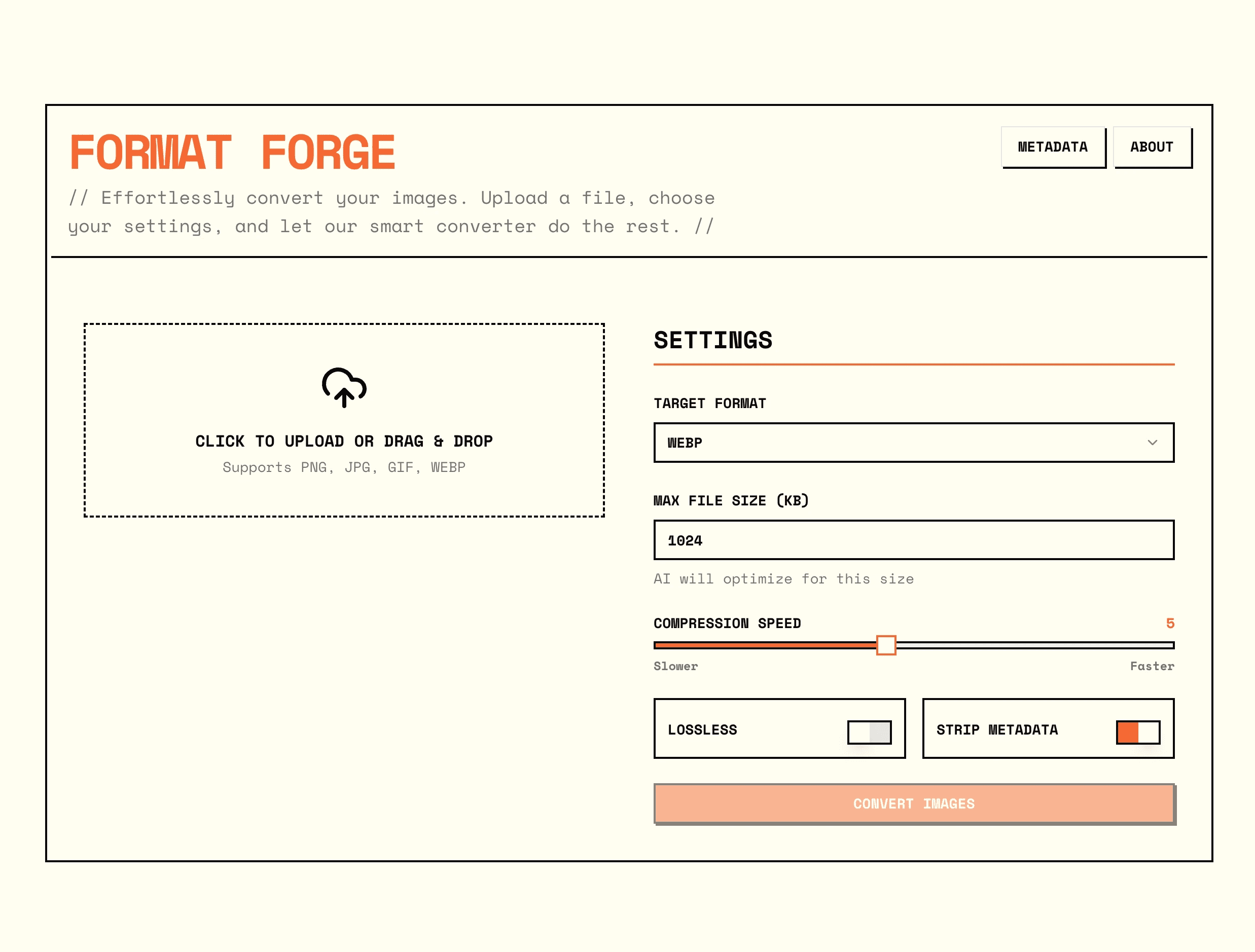 Format Forge is a web-based image conversion tool that uses AI to intelligently optimize your images. Upload images, set your desired format and file size, and let our AI advisor recommend the best compression settings to achieve your goals while preserving maximum quality.